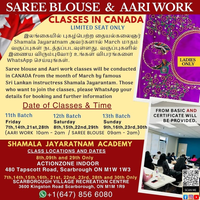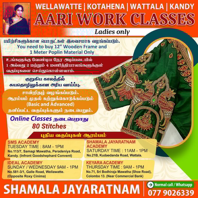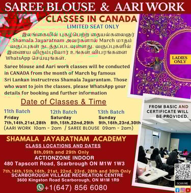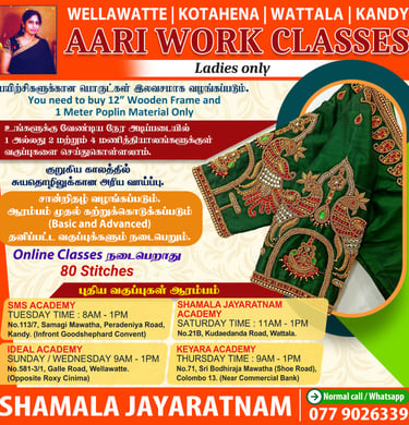 Join the Shamala Jayaratnam Academy to enhance your skills in aari work, learn the art of saree blouse design, and master the techniques of tailoring. Our classes are designed for learners of all levels, whether you're a beginner looking to dive into the world of textile arts or an experienced artisan wanting to refine your abilities. With expert instructors guiding you through hands-on sessions, you'll gain valuable insights and practical experience. Not only will you create beautiful garments, but you'll also discover the rich cultural heritage associated with these skills. Enroll today and take the first step towards becoming proficient in these timeless crafts, opening up new opportunities for creativity and self-expression.